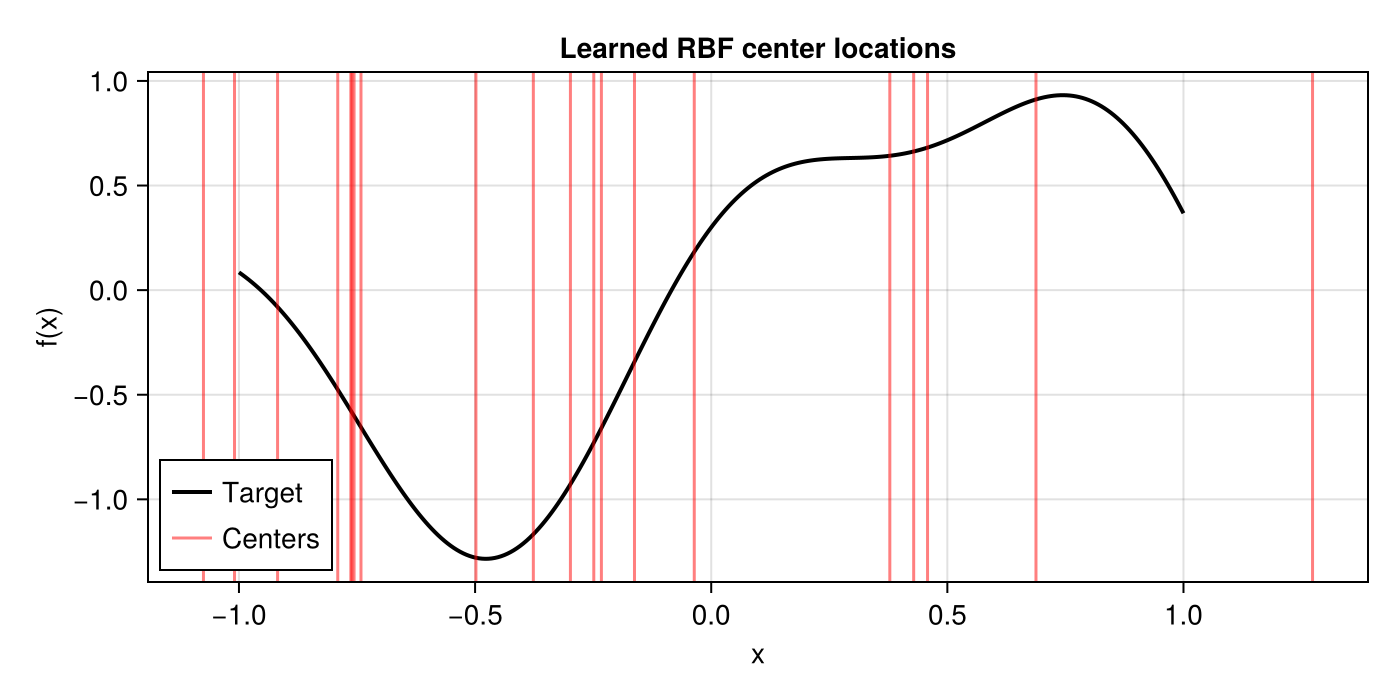 ax = Makie.Axis(fig[1, 1]; xlabel="x", ylabel="f(x)", title="Learned RBF center locations")